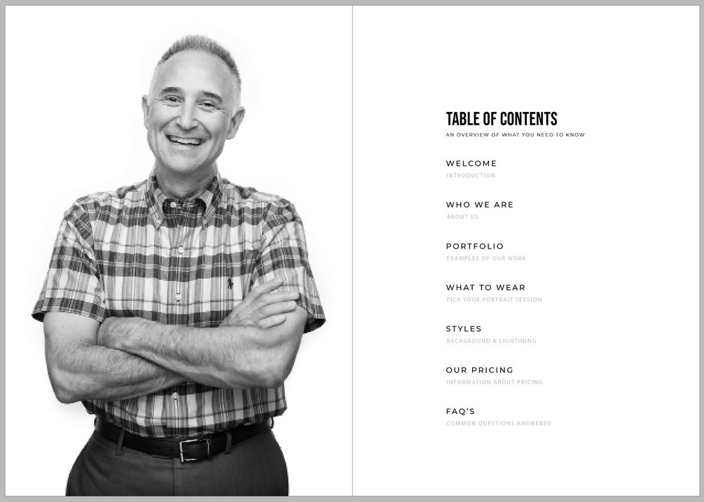 This simple and beautiful headshot and pricing guide is a fantastic way to show your clients, both digitally and in print, the best of your business. This is a completely customizable Adobe InDesign template ready to export for print or online use. All you have to do is add your images and copy! Use it exactly like you see it (with your images, of course) or use it as a starting point to make the headshot guide that's perfect for you.